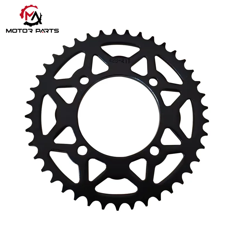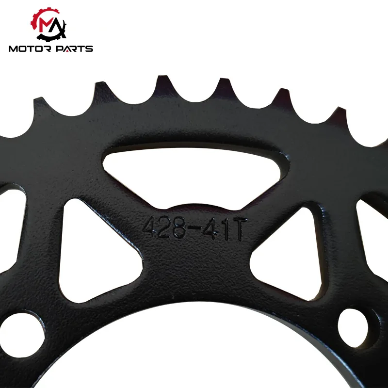 Кәсіби мотоцикл жұлдызшасының зауыты ретінде біз жоғары созылатын легирленген болатты қолданамыз және 428-41T мотоцикл тісті доңғалақтарының негізгі құрамдас бөліктері күшті соққыға төзімділігін сақтай отырып, тіс бетінің жеткілікті қаттылығын қамтамасыз ету үшін CNC дәлдікпен қалыптау және екі сатылы термиялық өңдеу процесін (сөндіру және шынықтыру) қолданамыз. 41 тіс спецификациясы жеделдету реакциясы мен отын үнемдеу үшін оңтайландырылған.