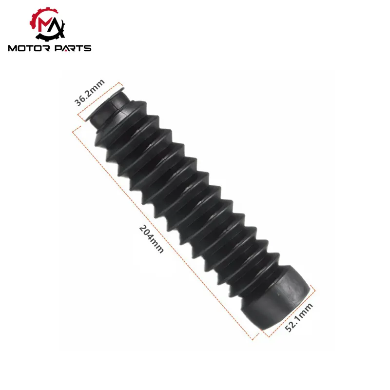 Мотоциклдің алдыңғы амортизаторының шаң қақпағы серпімділігі жоғары және жұмсақ материалдардан жасалған, ол амортизатордың кеңеюі мен жиырылуынан туындайтын нәзік тербелістерді тиімді басуға мүмкіндік береді, сонымен бірге дірілден туындаған шуды айтарлықтай азайтады, сонымен бірге айдау жайлылығын арттырады; Кейбір өнімдер қалыңдатылған құрылымдармен арнайы жасалған, олар қарапайым модельдермен салыстырғанда салмағын 30% арттырады. Олар амортизаторларды жан-жақты қорғауды қамтамасыз ете отырып, кішкентай тас соққылары мен ағаш бұтақтарының сызаттары сияқты сыртқы әсерлерге қатты қарсы тұра алады.