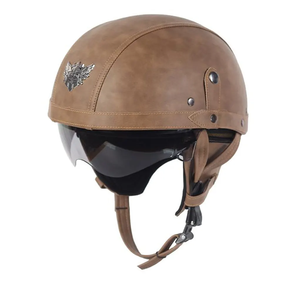 Көзілдіріктері бар мотоциклдің жарты бет дулыға былғары 1960 жылдардағы ретро міну стилін қайта жасау үшін былғары құрылымын металл ілмектермен біріктіріп, классикалық ұшу дулығаларынан шабыттандырылған. Практикалық қажеттіліктерді қанағаттандыра отырып, ол ретро мотоциклдерге, крейсерлерге және жеке модификацияланған модельдерге жарамды қалалық міну және көше мәдениетіндегі көрнекі ерекшелікке айналады.